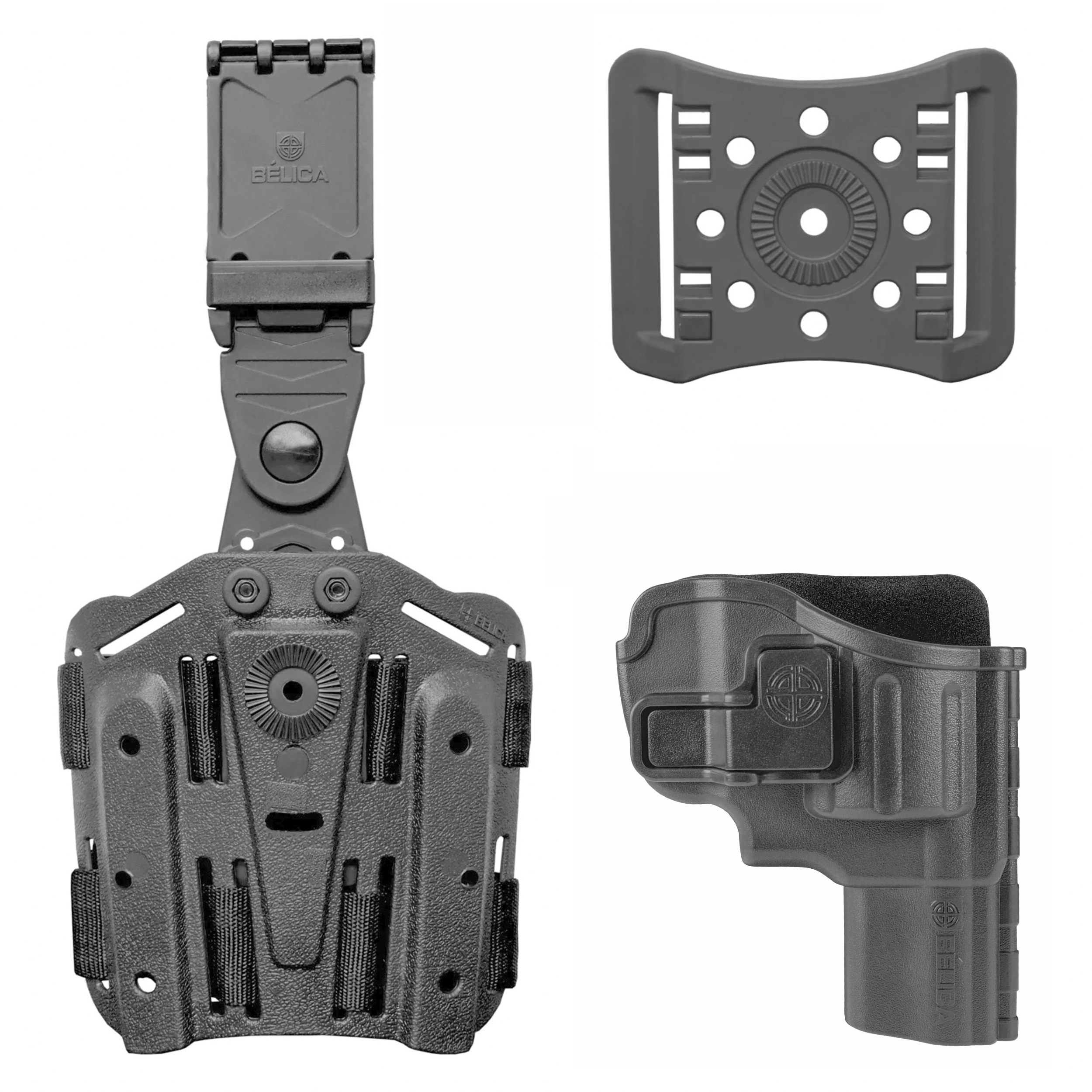 O Combo Revólver 5T Bélica foi desenvolvido para os revólveres de 5 tiros. A tecnologia da trava de saque rápido continua presente, proporcionando maior segurança em seu uso, além de maior agilidade no saque. Seu sistema de catraca rotativa que possibilita o ajuste da angulação do coldre, garantindo conforto no manuseio do equipamento. Com o Combo Revólver 5T Bélica você terá a possibilidade do seu coldre tanto na plataforma de perna, quanto na plataforma de cintura.